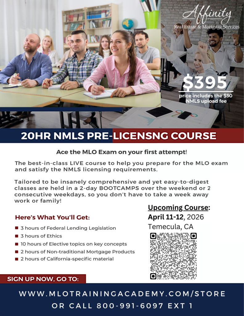 ONLINE NMLS 10 DAY – 20 HR SAFE COMPREHENSIVE: MORTGAGE LOAN ORIGINATOR COURSE #11771 – January 26, 2026, through February 6, 2026 (Registration ends 1/23 @ 6 pm (pst)