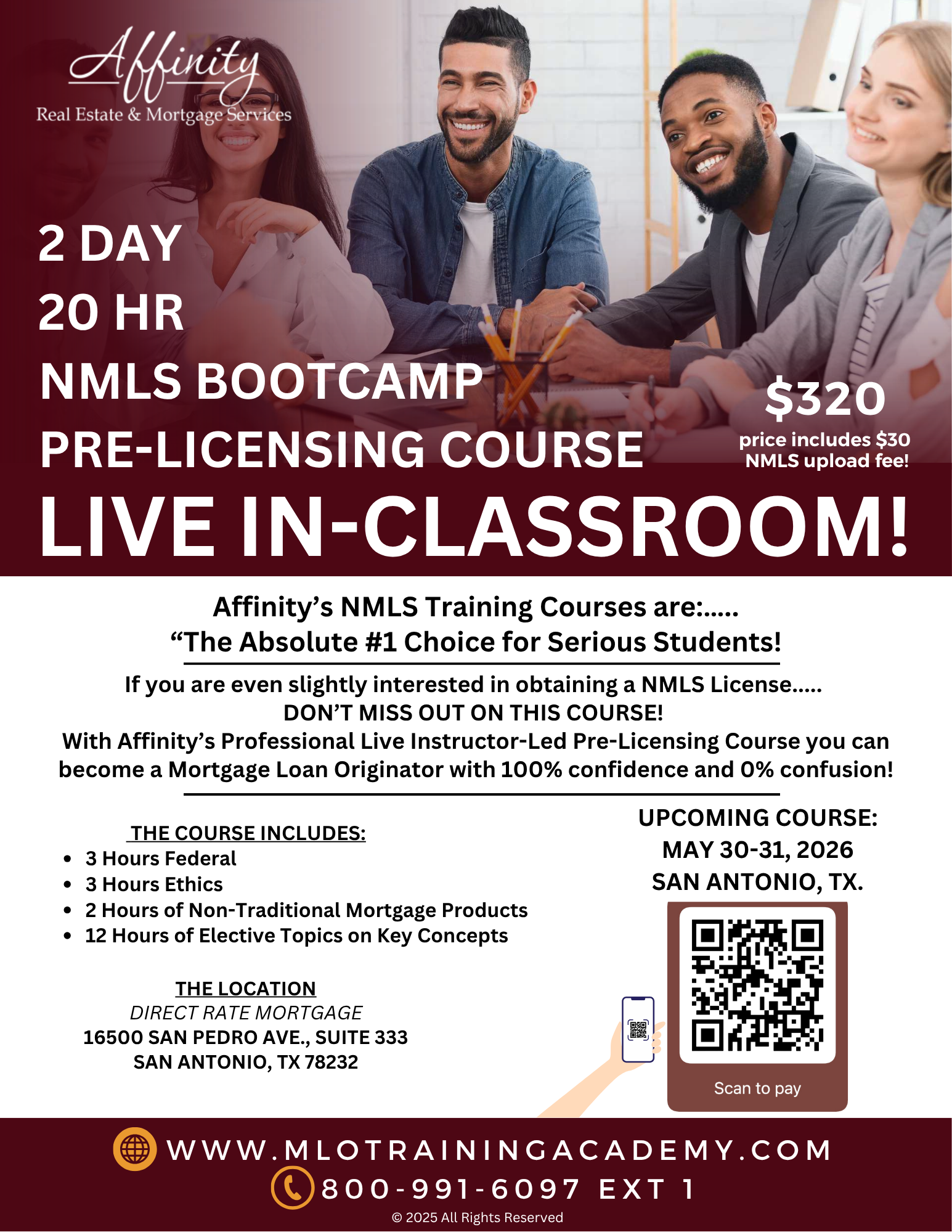 ONLINE NMLS 5 DAY - 20 HR CA-DFPI SAFE: COMPREHENSIVE MLO COURSE #7932 – May 25, 2026 thru May 29, 2026 (Registration ends 5/22 @ 6 pm (pst) Affinity’s NMLS Approved is a five-day online course that requires 4-5 hours per day to complete. The course is offered every Monday–Friday. If the course cannot be completed within the timeframe, the NMLS […]