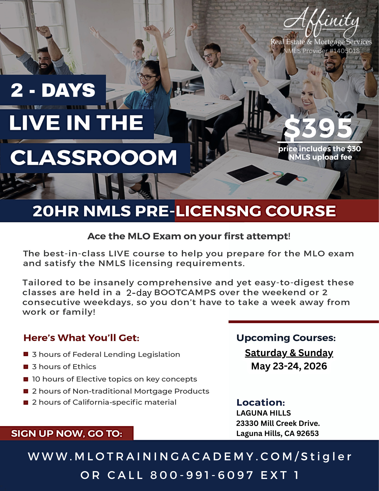 ONLINE NMLS 10 DAY - 20 HR CA-DFPI SAFE: COMPREHENSIVE MLO COURSE #17771 – May 11, 2026 thru May 22, 2026 (Registration ends 5/8 @ 6 pm (pst) Affinity’s NMLS Approved is a five-day online course that requires 4-5 hours per day to complete. The course is offered every Monday–Friday. If the course cannot be completed within the timeframe, the […]